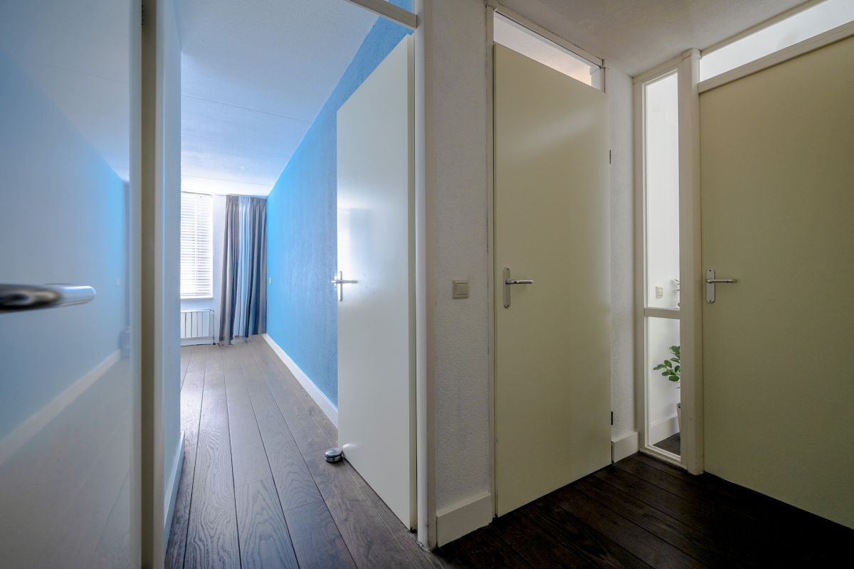 Het appartement beschikt over twee comfortabele slaapkamers, waarvan één eveneens toegang biedt tot het balkon. De badkamer is compleet met ligbad/douchecombinatie en wastafel. Daarnaast is er een separaat toilet met fonteintje aanwezig. Vanuit de hal bereikt u tevens een praktische inpandige berging met meterkast. In vrijwel het gehele appartement ligt een sfeervolle houten vloer.