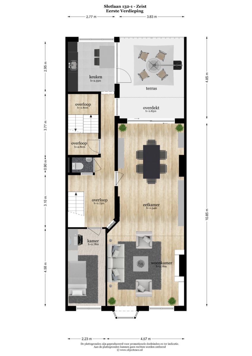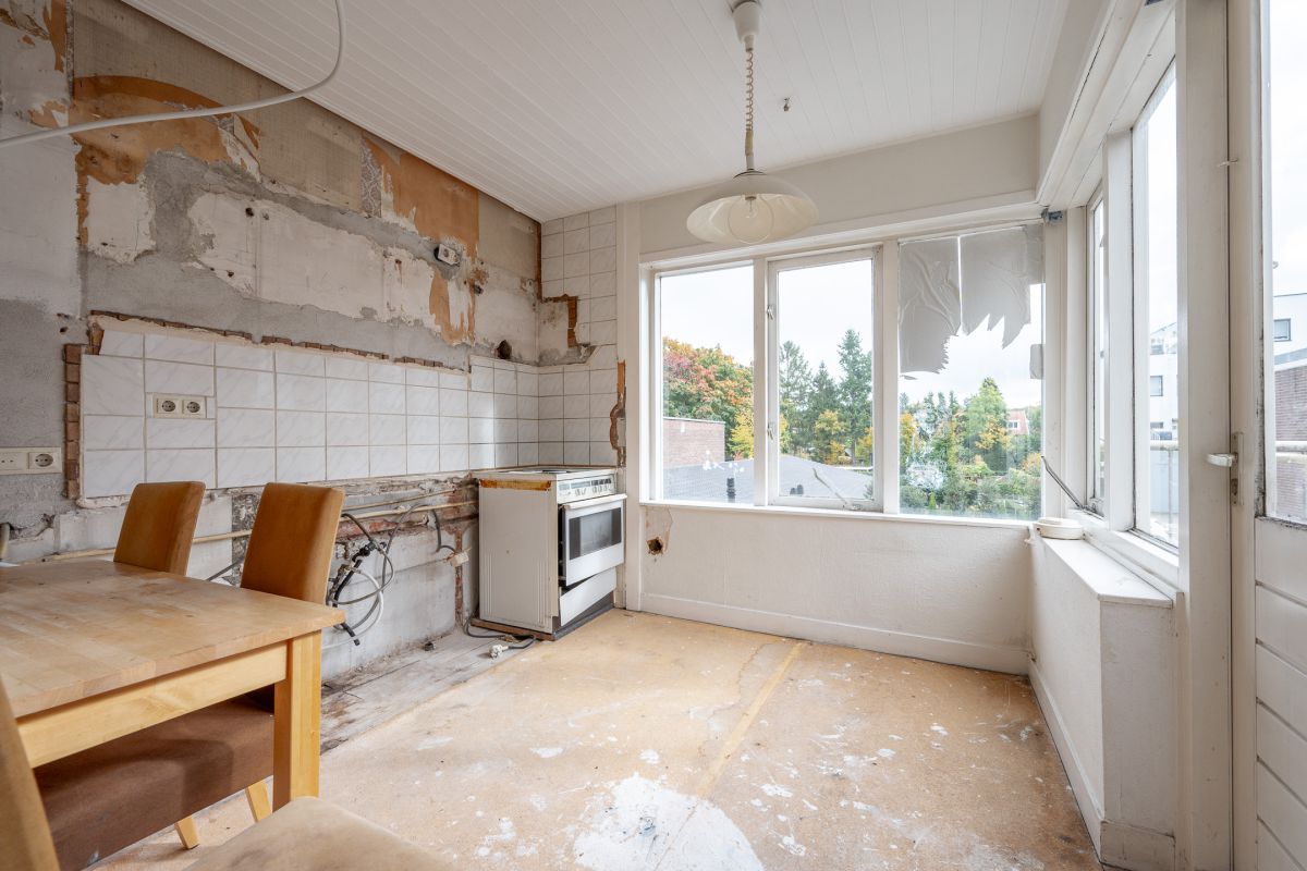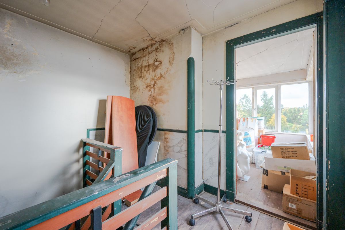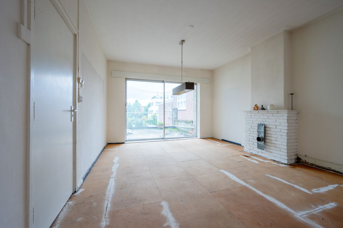 1e VERDIEPING: De royale woonkamer heeft 2 ruime zitgelegenheden en toegang tot het deels overdekte dakterras van circa 20 m². De ruime leefruimte heeft aan de voorzijde een fraaie erker met een gezellig uitzicht op de Slotlaan. Op deze etage bevinden zich tevens een extra (slaap)kamer, een toilet, de keuken en de trap naar de tweede etage (alsmede het huidige tweede trappenhuis).