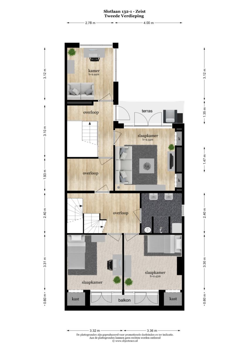 2e VERDIEPING: De tweede etage heeft 4 slaapkamers, waarvan 2 met een stenen balkon aan de Slotlaan. De grote slaapkamer heeft openslaande deuren met toegang tot een balkon (ca. 5 m²) aan de achterzijde. Tevens bevinden de badkamer met douche, vaste wastafel en elektrische boiler zich op deze etage.
