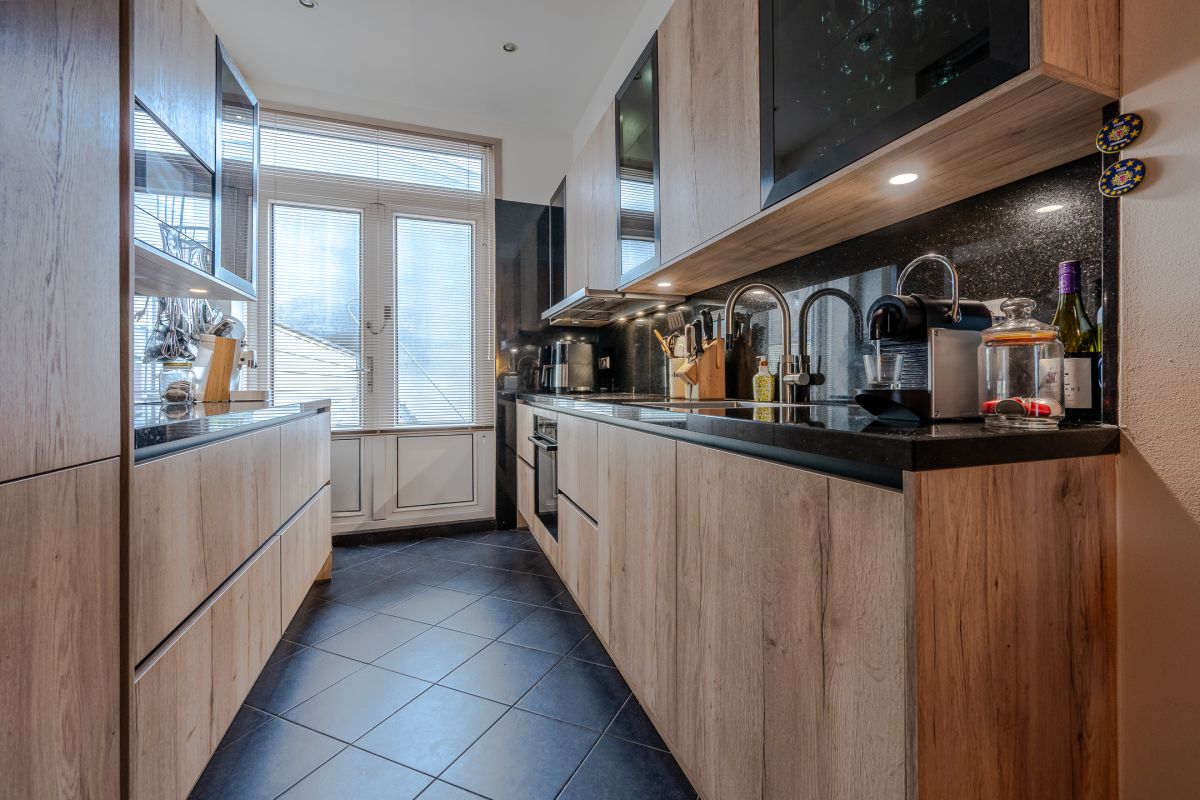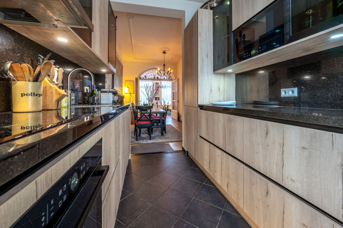 Ruime overloop met toegang tot de royale woon- en eetkamer, voorzien van een PVC-vloer met dubbele ondervloer en veel lichtinval. Aansluitend bevindt zich de volledig gemoderniseerde keuken (2022), uitgerust met hoogwaardige Bosch-inbouwapparatuur, waaronder een Quooker, heteluchtoven, magnetron, 5-pits inductiekookplaat, afzuigkap, vaatwasser en koel-vriescombinatie.